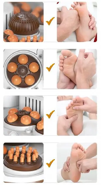Масаж ступнів проводиться шляхом дії розташованих на дні пристрою спеціальних головок. Модель оснащена акупунктурною поверхнею, за допомогою якої масажна дія виробляється на біологічно активні точки, що є на ступнях ніг.