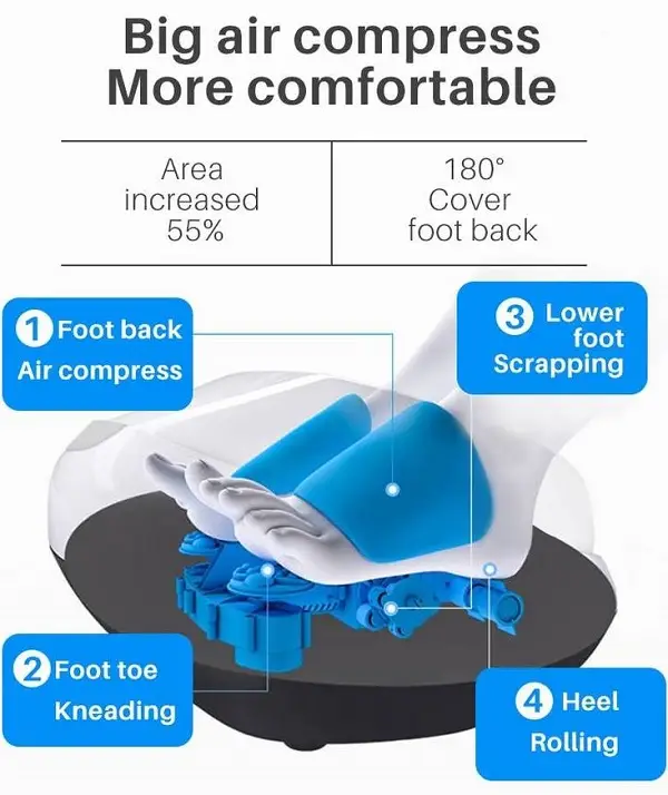 Удосконалена модель 2020 року, яка вже давно займає провідне місце з продажу серед подібних масажерів, так як поєднує в собі якісний роликовий масаж різної сили (регулюється), компресійний вплив на ногу від легкого до сильного, функція прогріву-тобто має повністю всі види масажу , які є у подібних масажерів, і при цьому має високу якість та низьку ціну.